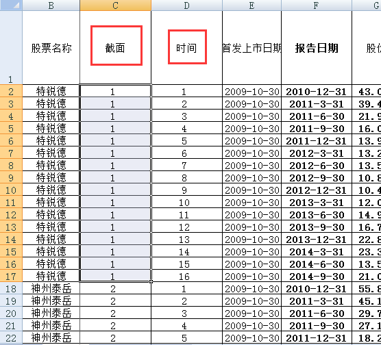 如图,是99*16的面板数据。我在excel表格中用16个1,16个2,16个3 .....来表示截面变量的取值,再用99个 1 2 3 ... 15 16,来表示时间变量的取值。