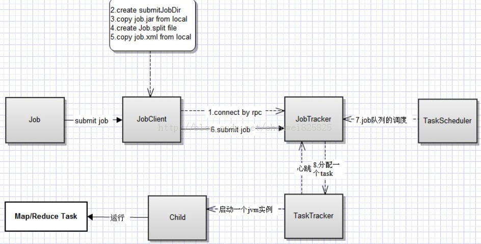 MapReduce 执行过程 1.Job类初始化JobClient实例,JobClient中生成JobTracker的RPC实例,这样可以保持与JobTracker的通讯,JobTracker的地址和端口等都是外部配置的,通过Configuration对象读取并且传入。