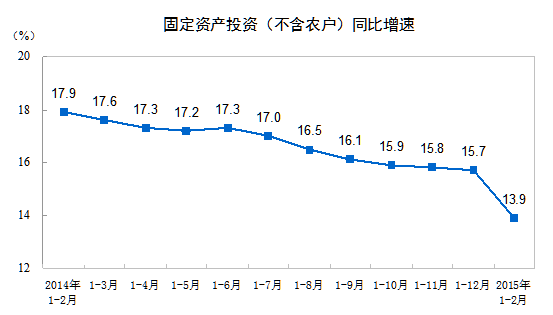中国网财经3月11日讯 据国家统计局消息,2015年1-2月份,全国固定资产投资(不含农户)34477亿元,同比名义增长13.9%。从环比看,21.03%。