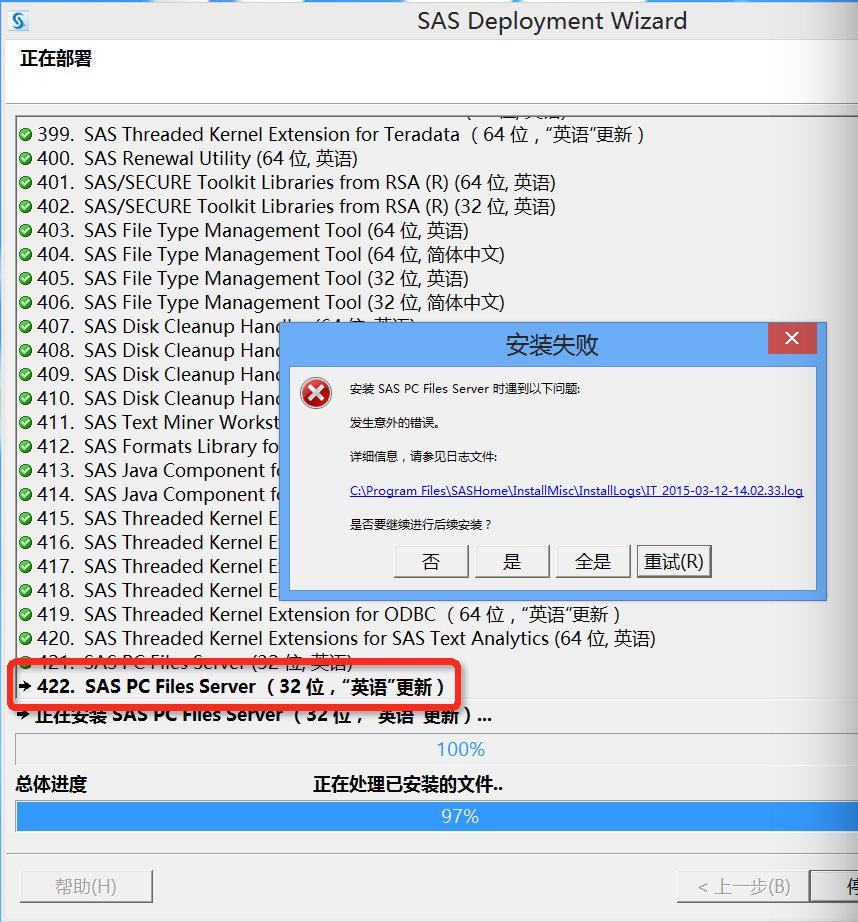这类问题在论坛里已有很多老手给出答案了,我遇到的也是典型的422项的“SAS PC Files Server”安装失败,属于正常现象不影响使用。