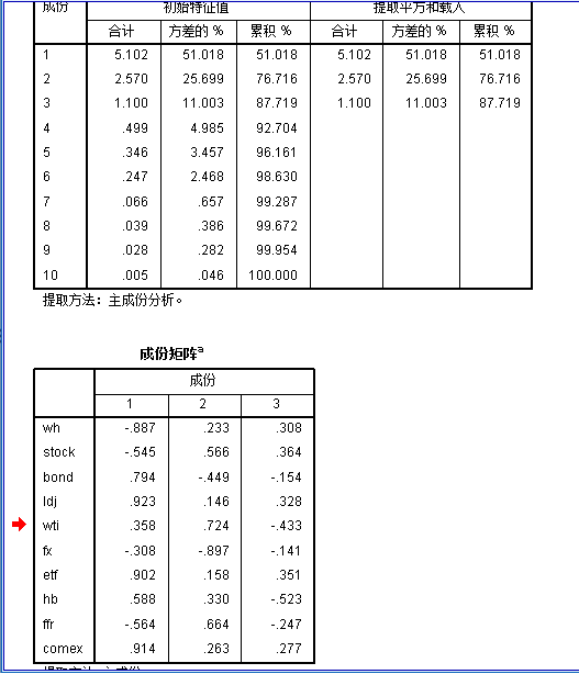 主成分分析最后得出成分矩阵,如图,共有10个变量,图中可知wh、bond、ldj、etf、comex、hb 6个指标在第一主成分上有较高载荷,fx、ffr、stock、wti 4个指标在第二主成分上有较高载荷,是不是意味着前面两个主成分就已经可以基本反映全部指标的信息,那第三个主成分就是没有反映任何指标的信息了,不就是多余的吗?因为要做进一步分析,要搞清楚每个成分分别反映哪些指标。