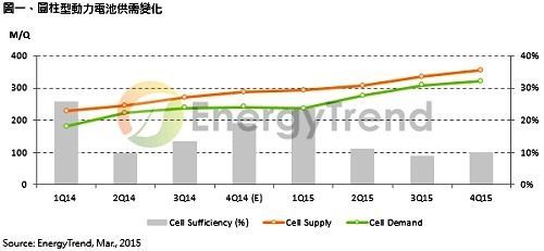 根据TrendForce旗下绿能事业处EnergyTrend的数据显示,随着环保意识兴起,电动自行车与电动汽车市场逐渐普及。整体圆柱型动力电池需求将从2014年的8.82亿颗成长至2015年的11.71亿颗,年成长率达32%。此外,在IT产业低毛利的趋势下,绿色产业持续永续发展,推动储能系统市场规模在2020年达到1,850MWh。