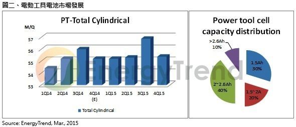 在IT需求逐渐走向轻薄化而减少电池芯颗数的趋势下,动力工具更是电池芯厂积极加入的蓝海市场。由于电动工具功率输出较高,产品寿命要求也较为严苛,市场需求稳定发展,然而同样面临电池容量提升而使用颗数降低的现象,因此2015年度锂电池在电动工具市场需求仍维持持平局面,约占2.2亿颗。