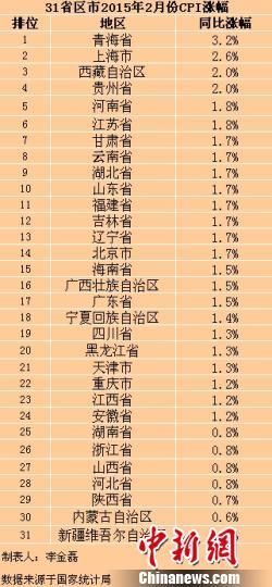 在这31个省份中,青海2月份CPI同比涨幅最高,为3.2%,也是全国仅有的CPI涨幅在“3”时代的地区。新疆涨幅最低,仅为0.4%。