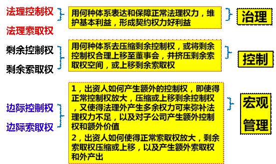 3,除法理两权(治理),剩余两权(控制)维度外,母公司产权收益还取决于更大的边界。即边际两权,边界控制权----边际法理控制权+边际法理外控制权,边际索取权----边际法理索取权+边际法理外索取权。索取权设计都可以融入到宏观管理体系中去。
