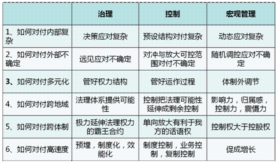 综上所述,治理,控制,宏观管理从三个不同的维度,集成了集团价值的最大化。也解决了如干集团发展过程中的重大问题,比如多元化,跨地域,跨体制,内部复杂性,外部不确定性等等。