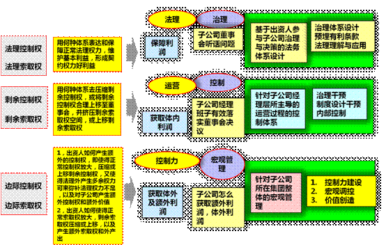 宏观管理,研究如何通过边际两权获取体外及额外利润,尤其是子公司怎么获取额外利润,体外利润。思考几个要点,1,出资人如何产生额外的控制权,即使得正常控制权放大,压缩或上移剩余控制权,又使得法理外产生多余权力可来弥补法理权力不足,以及对子公司产生额外控制权和额外价值 2,出资人如何使得正常索取权放大,剩余索取权压缩或上移,以及产生额外索取权和外产出。针对子公司所在集团整体的宏观管理,控制力建设,宏观调控,价值创造
