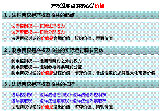2,必须追溯到起点,法理两权是产权及收益的起点,法理控制权----正常法理权力,法理索取权----正常分配权力。法理两权讨论的价值是合规价值,契约价值,票面价值,所有法理的设计都可以归结到治理体系设计中去。即如何实现法理权力表达,决策权力框架,利益保障,风险规避,与外部控制的接口。