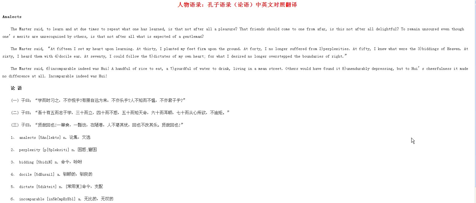 The Master said, to learn and at due times to repeat what one has learned, is that not after all a pleasure? (一) 子曰:“学而时习之,不亦悦乎?有朋自远方来,不亦乐乎?人不知而不愠,不亦君子乎?”