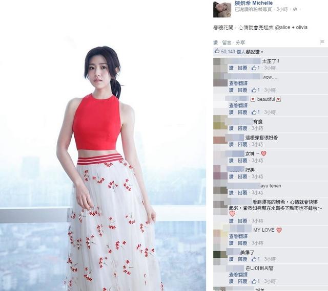 照片中,陈妍希身穿红色短版背心,加上布满小红花的白色长纱裙,衬托出雪白的肌肤,也展露出非常纤细的小蛮腰,腹部上有明显的肌肉线条,整个人的身材非常玲珑有致。她将亮丽的照片PO至脸书上,并写下一句“春暖花开,心情就会亮起来。”立刻掀起网友热烈讨论,多数人都一面倒地觉得她变好瘦,“比起演小龙女时还要瘦”,还有人激动地说小肚肚好漂亮。