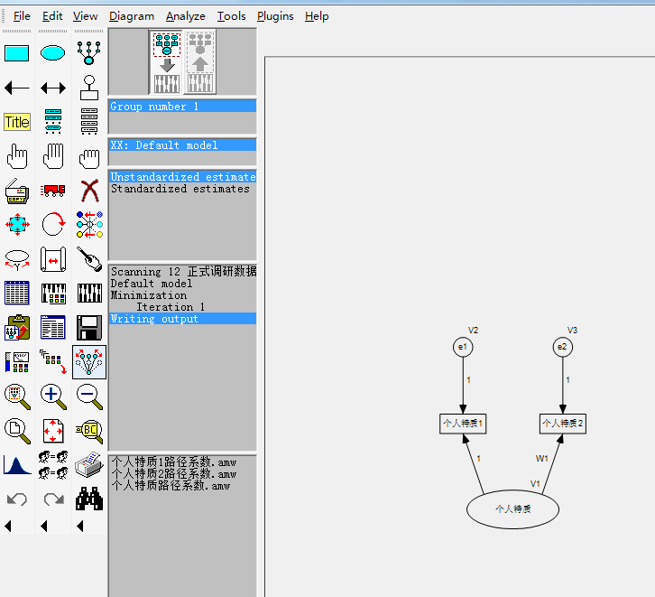 籣煙草 发表于 2015-3-26 14:42 我想用amos做出两个观测变量和一个潜在变量之间的路径系数,然后再 算出两个观测变量的权重,如图上面 但是 ...