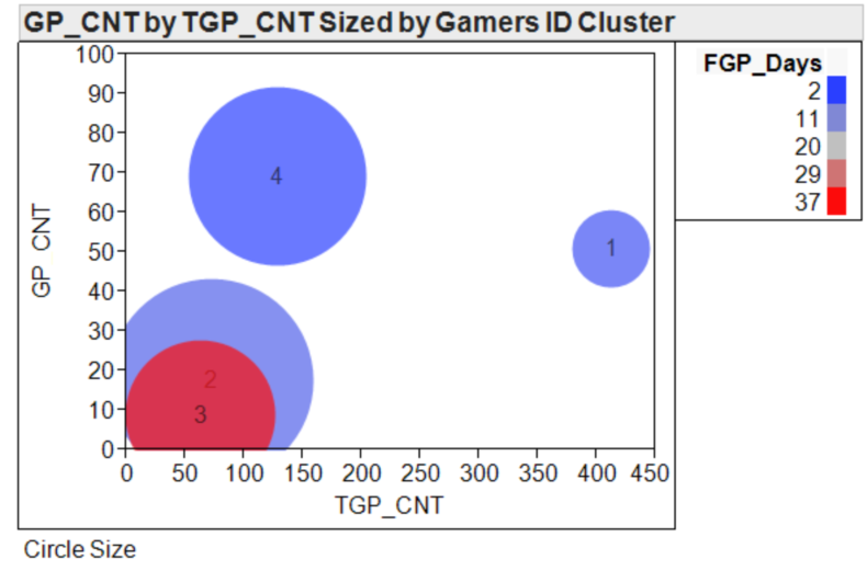 因为很多变量是非正态分布,我们选取K-means进行聚类分析,选择聚类组数3组到12组之间进行探索,经过探索发现当分为4类的时候,各项统计指标最佳(CCC最大),Biplot输出图形具有很好的分辨力,同时分类结果在业务理解与应用上也可以对各类不同玩家进行很好的阐释。