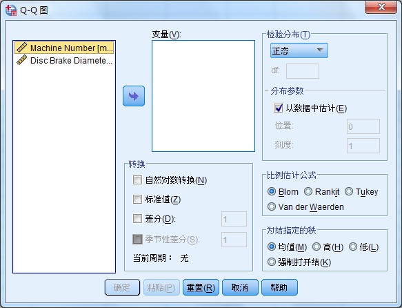 1变量选项栏:选择绘制pp图的变量,可多选;2检验分布选项栏:用于检测待检验分布的类型,如beta,卡方,支付,伽马,半太,logistic,对数正态,正太等,其下的df用于设置自由度;3分布参数选项:可由SPSS自动从数据中估计,也可以自定义;4转换选项栏:定义数据的转换处理方式;5比例估计公式:定义预期正态概率值的方法;6为结指定的秩,对多个不同的变量值的处理方式。