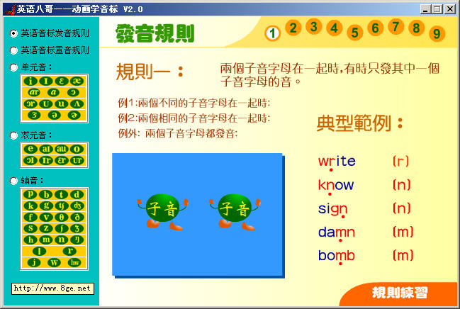主要功能包括发音规则、重音规则、单元音、双元音、辅音发音五大部分内容,flash动画教学,特别是那女声发音,非常悦耳动听。本软件有声有色,使用简单,很适合希望纠正英语发音的朋友,由于趣味强,也可以用来教儿童学英语。