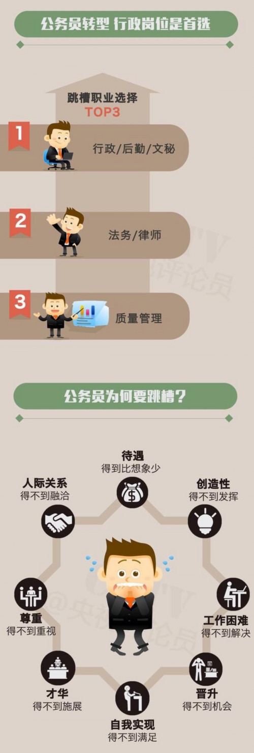 人力资源服务网站的报告认为,主要原因是“受反腐影响”。这观点是正确的,不能说错,但太简单以致引发歧义,认为仅仅是反****导致公务员权力红利减少而选择离开。这当然是原因之一,但绝不是全部原因。有网友就提出:按理说,没有反腐前,公务员上升通道被有背景的人占据,他们更应该离职的啊。为什么反腐了,他们升迁机会来了,反倒要跳槽呢?