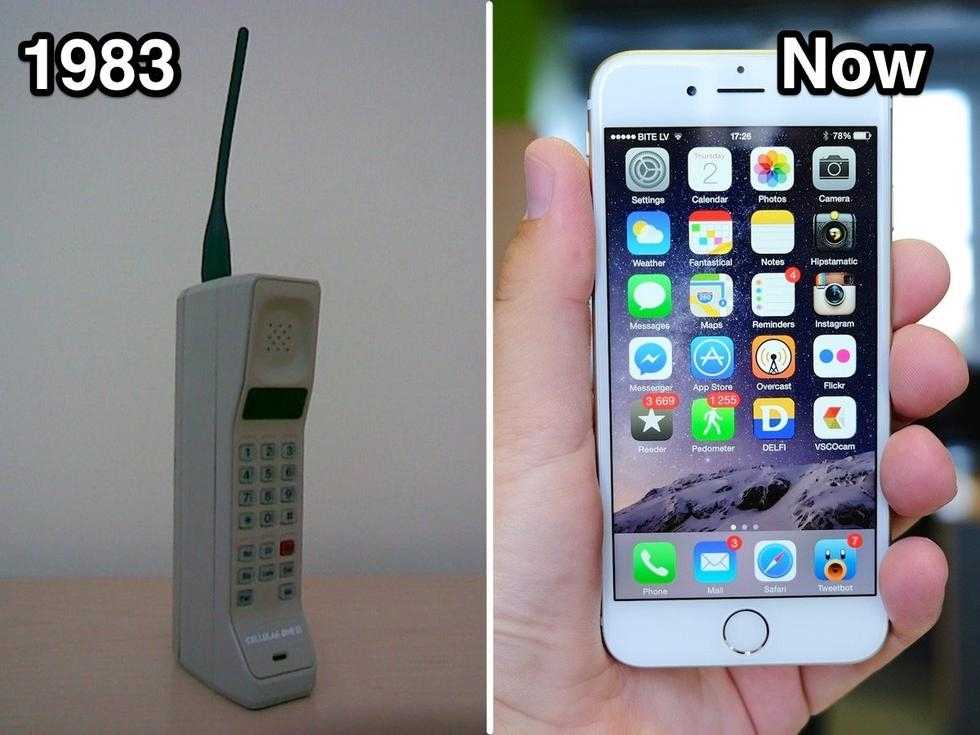 市场上销售的第一款手机被称为DynaTac,是摩托罗拉1984年推出的。与今天4.7英寸的iPhone 6相比,第一款手机绝对堪称巨大。