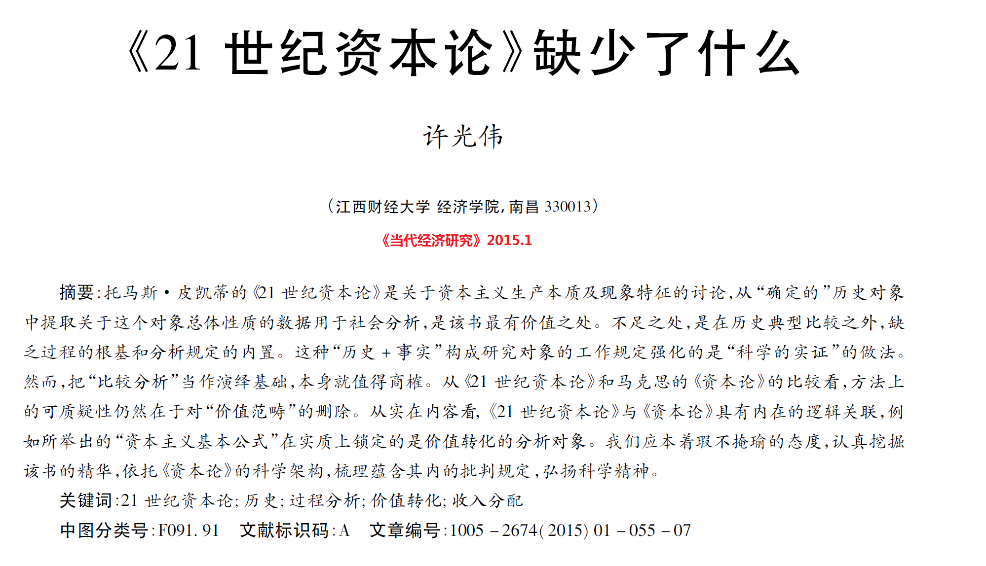 【摘要】:托马斯·皮凯蒂的《21世纪资本论》是关于资本主义生产本质及现象特征的讨论,从"确定的"历史对象中提取关于这个对象总体性质的数据用于社会分析,是该书最有价值之处。不足之处,是在历史典型比较之外,缺乏过程的根基和分析规定的内置。这种"历史+事实"构成研究对象的工作规定强化的是"科学的实证"的做法。然而,把"比较分析"当作演绎基础,本身就值得商榷。从《21世纪资本论》和马克思的《资本论》的比较看,方法上的可质疑性仍然在于对"价值范畴"的删除。从实在内容看,《21世纪资本论》与《资本论》具有内在的逻辑关联,例如所举出的"资本主义基本公式"在实质上锁定的是价值转化的分析对象。我们应本着瑕不掩瑜的态度,认真挖掘该书的精华,依托《资本论》的科学架构,梳理蕴含其内的批判规定,弘扬科学精神。