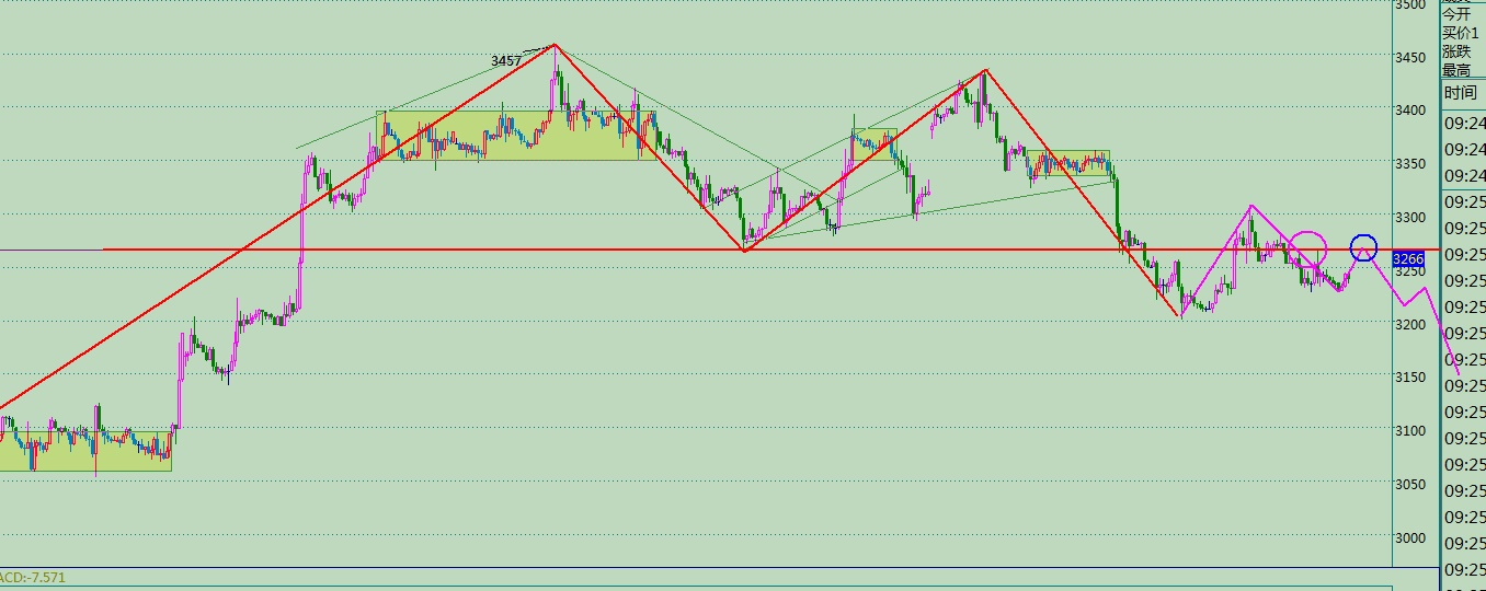 “M”顶形态就现在来看,正处于颈线附近,行情的下一步走势将会以空头为主,目前顶部处于前期相对高位3430-3460一线,下方颈线位位于3270附近,当前价格处于颈线下方,短期有回调蓄能的趋势,激进的朋友可在日内亚盘时段3220附近介入空单,博取小幅拉伸的空间,稳健的朋友可以选择在3260-3280一线内介入空单目标先看在3200一线整数关口