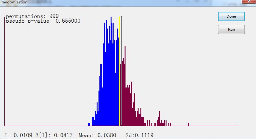 最近在学习使用GeoDA软件进行空间相关分析,我在得到Moran's I 后,想计算P-value。看到论坛帖子,参考用999Randomization功能得到了P-value。但是P-value居然等于0.63400,而且前面还显示是pseudo P-value。看了相关文章明白这个是通不过显著性检验的,但是我想请问,问题可能出在哪里呢?有同学说是数据出了问题,那到底是什么问题呢?现在还没弄不明白,什么情况会导致这样的结果,我到现在还没看到pseudo P-value的字眼。求各位大神指导!非常感谢!