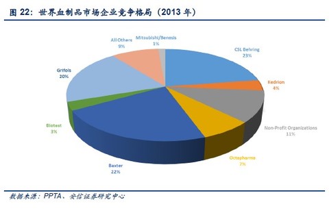 我国13 亿人口, 2013 年采浆不到5000 吨,差距悬殊,静态比较按照目前白蛋白使用量为供需均衡(因为白蛋白可以进口,不考虑静丙与小制品使用量逐步提升等因素),我国短期需要有10000 吨的采浆量。从需求端看,我国血制品临床使用还属于初级阶段,血浆利用率较低,从血浆中提取的制品数量少,价格端看静丙等制品还有较大提升空间,静丙将取代白蛋白成为血制品领域最重要的品种,销售额最高的品种。国际上血制品行已经形成寡头竞争的格局,我国行业集中度还有待提升。