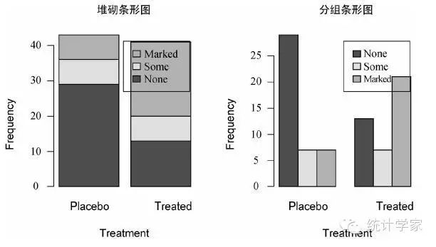 如果height是一个矩阵而不是一个向量,则绘图结果将是一幅堆砌条形图或分组条形图。若beside=FALSE(默认值),则矩阵中的每一列都将生成图中的一个条形,各列中的值将给出堆砌的“子条”的高度。若beside=TRUE,则矩阵中的每一列都表示一个分组,各列中的值将并列而不是堆砌。