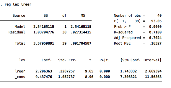 如题,这里ex和reer两个变量单独回归时回归系数是正的。理论上来说也应该是正的:人民币实际有效汇率(reer)上升,人民币贬值,出口量(ex)上升。