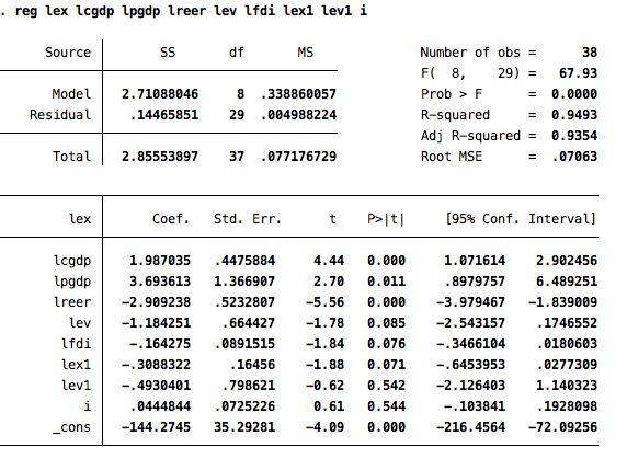 REER與CGDP、PGDP的簡單相關係數高達0.90以上,此時就會產生「多元共線性」的問題,使得係數由正變負(或相反)。 建議:REER、CGDP、PGDP只選擇1或2個變量即可。