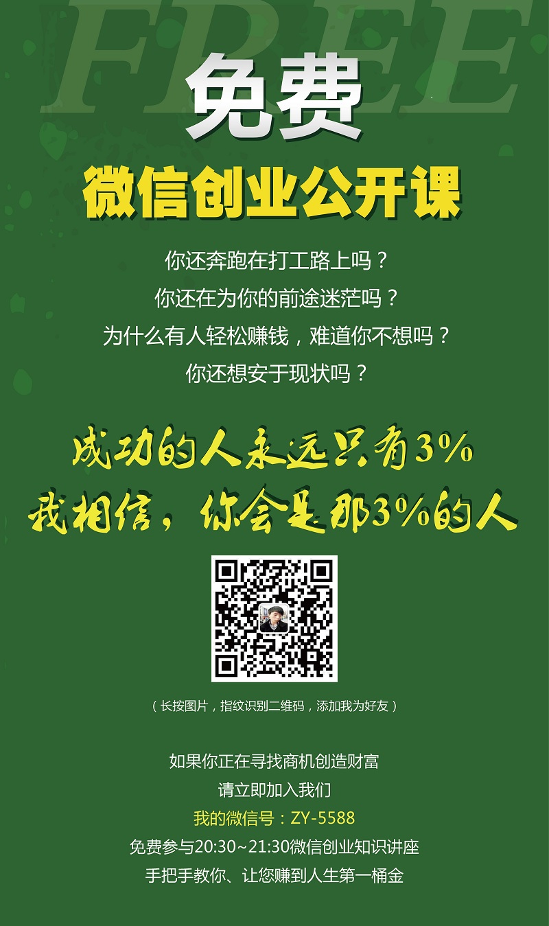 如果你正在寻找商机创造财富,请立即加入我们、微信ZY-5588免费参与20:30~21:30微信创业知识讲座。手把手教你、让您赚到人生第一桶金。