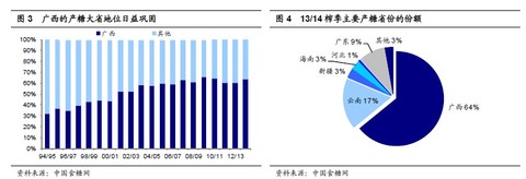 国内食糖供应波动明显。食糖供应波动较大,源于导致食糖供给不确定性的因素非常多,最重要的影响因素是播种面积和天气,其中播种面积与产量呈现正相关的关系。随着糖价下跌,国内糖料播种面积开始缩减,产量开始下降,14/15榨季国内产量预计为1080万吨,减产幅度高达20%,同时预计2015/16榨季广西的播种面积仍将下降,仅有1450万亩,降幅7%。我国80%以上食糖使用甘蔗作为原料,而广西是我国最大的制糖省份,也是糖料蔗的种植大省。由于糖料种植在农业经济中占有重要地位,涉及到4000多万蔗农的收入,也是广西、云南等地区的支柱产业之一。为加强糖料管理,规范糖料收购秩序,促进制糖行业