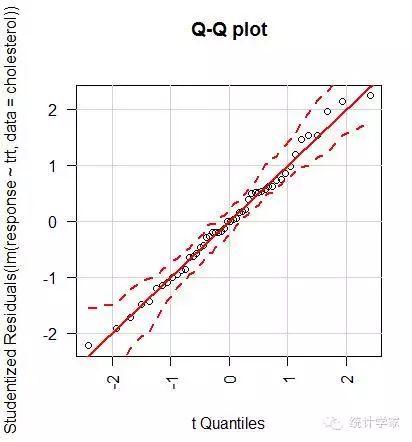 > qqPlot(lm(response~trt,data=cholesterol),simulate=TRUE,main="Q-Qplot",labels=FALSE)