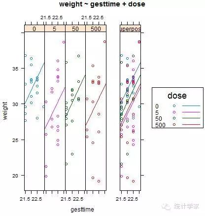 > ancova(weight~gesttime+dose,data=litter)
