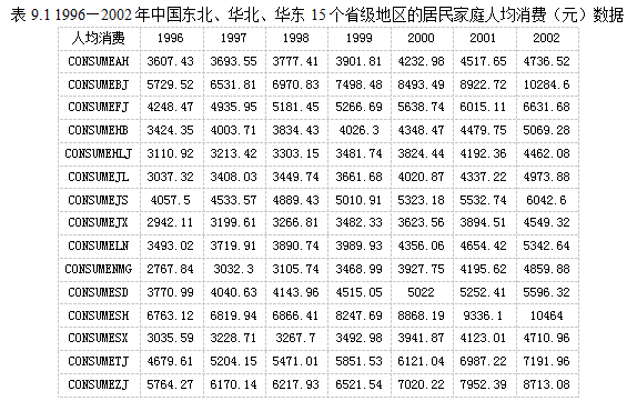 已知1996—2002年中国东北、华北、华东15个省级地区的居民家庭人均消费(