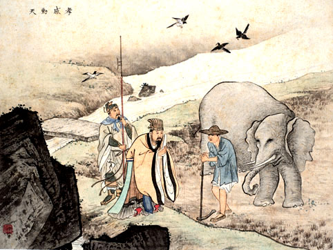 舜,传说中的远古帝王,五帝之一,姓姚,名重华,号有虞氏,史称虞舜。相传他的父亲瞽叟及继母、异母弟象,多次想害死他:让舜修补谷仓仓顶时,从谷仓下纵火,舜手持两个斗笠跳下逃脱;让舜掘井时,瞽叟与象却下土填井,舜掘地道逃脱。事后舜毫不嫉恨,仍对父亲恭顺,对弟弟慈爱。他的孝行感动了天帝。舜在厉山耕种,大象替他耕地,鸟代他锄草。帝尧听说舜非常孝顺,有处理政事的才干,把两个女儿娥皇和女英嫁给他;经过多年观察和考验,选定舜做他的继承人。舜登天子位后,去看望父亲,仍然恭恭敬敬,并封象为诸侯。
