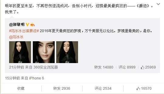 4月27日晚9点,导演郭敬明通过微博宣布:“2016年夏天最疯狂的梦境,万千美丽无以伦比,梦境里最美的,是你。@范冰冰”并公布三张范冰冰面部特写版海报。范冰冰也随即转发导演微博:“明年的夏至未至,不再悲伤逆流成河,告别小时代,迎接最美最疯狂的——《爵迹》。我来了。”成为首位确认加盟电影《爵迹》的主演。但此次公布的信息中,仍未曝光范冰冰参演的是《爵迹》中的哪个角色,显得十分神秘。导演微博一经发出,网络瞬间沸腾,不少网友纷纷表示:“四爷范爷首度合作,《爵迹》一定美翻了”、“冰冰会演哪个角色啊,好期待快公布角色吧”。 范冰冰成为《爵迹》首位主演的消息经导演郭敬明网络发布后,从27日晚9点到28日早7点,这一非用户活跃时间的10小时内,转发已破6万,回复数超过4万,点赞破17万。并取得热门话题右侧第一位,热门微博小时榜第一位、二十四小时榜第一位,热门话题小时榜第一位,热门话题二十四小时榜第4位,热门话题电影榜第1位的好成绩。“范冰冰爵迹”关键词还一举冲上热搜榜高位。
