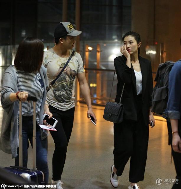 高圆圆黑超遮素颜赶机赴美 呆坐撅嘴频卖萌