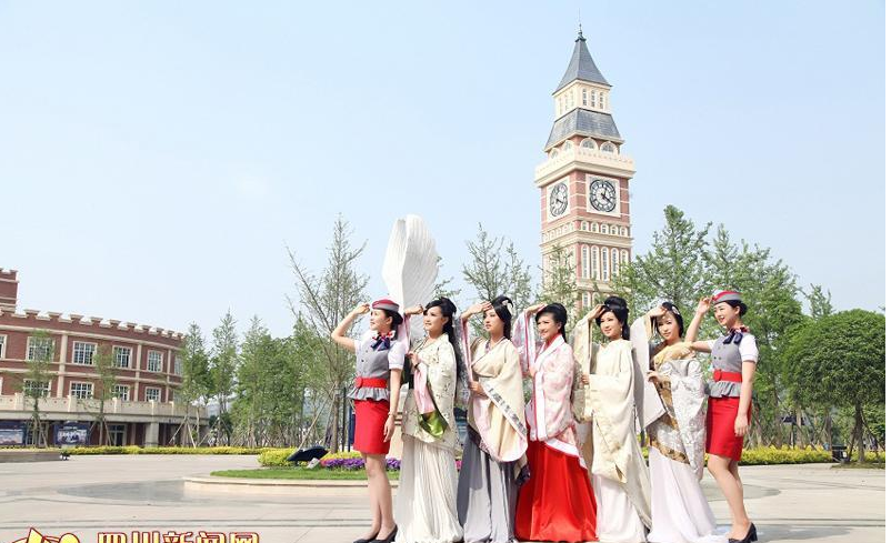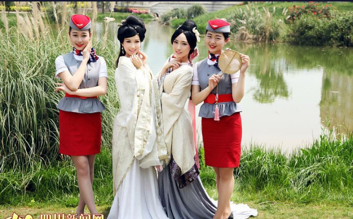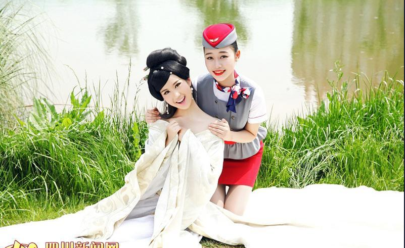 照片中,八名准空姐有的身穿汉服、有的身穿空姐制服,或清纯可爱、或端庄优雅、或性感动人。记者了解到,这组照片是四川西南航空专修学院空乘专业的八名女生拍摄的毕业照。“我们都是同一个寝室的好姐妹,即将毕业分离,又都对汉服感兴趣,所以拍摄了这组创意毕业照,来纪念我们的大学和青春。”照片主角之一谢明敏告诉记者。