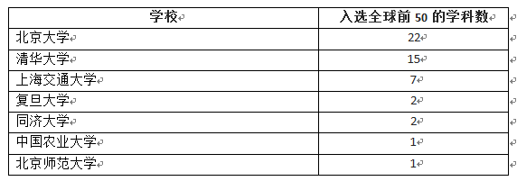 中国攀登至前50的7所大学分别为:北京大学、清华大学、上海交通大学、复旦大学、同济大学、中国农业大学和北京师范大学。其中,北京大学以各学科入选前50名的次数——22个学科、22次——在这7所大学中处于领先位置,清华大学以15个学科入选前50紧随其后。
