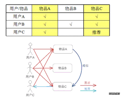 从这个简单的例子看出物品A和物品C是经常被一起购买的,那么我们可以将A,C看成是相似的,当用户C购买物品A的同时可以为他推荐物品C