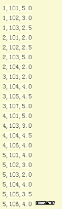 在上图的数据中每行3个字段,依次是用户ID,电影ID,用户对电影的评分(0-5分,每0.5分为一个评分点)