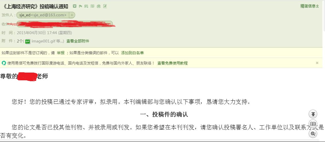 sje_ed@163.com的确认邮件,说文章拟录用,但系统里仍为“三审中”