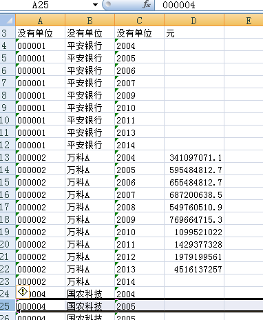 请教大神,怎么把图1变成图2的格式?每年份只保留一行,不管列4有没有数据?万分感谢!!!