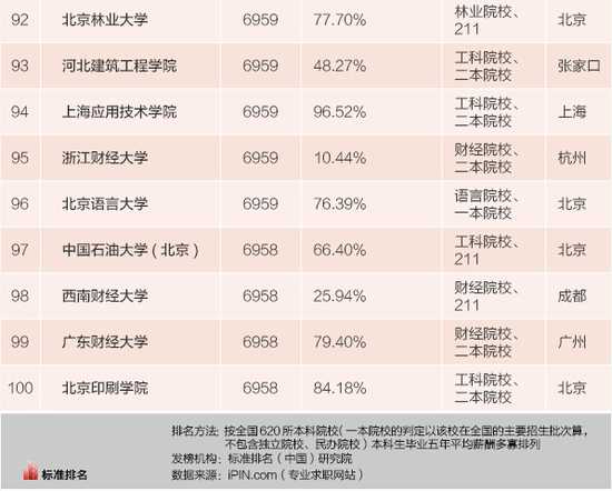 共有20个城市的100所大学上榜,68所大学位于北上广深等一线城市,其中北京高校有40所,上海高校有21所,广州为6所,深圳为1所。从进入100强的14所二本院校所在地来看,除了河北建筑工程学院和浙江财经大学外,也都位于北上广深等一线城市。即便是这两所院校,从就业地来看,也都集中在北京、杭州这样的高薪城市。