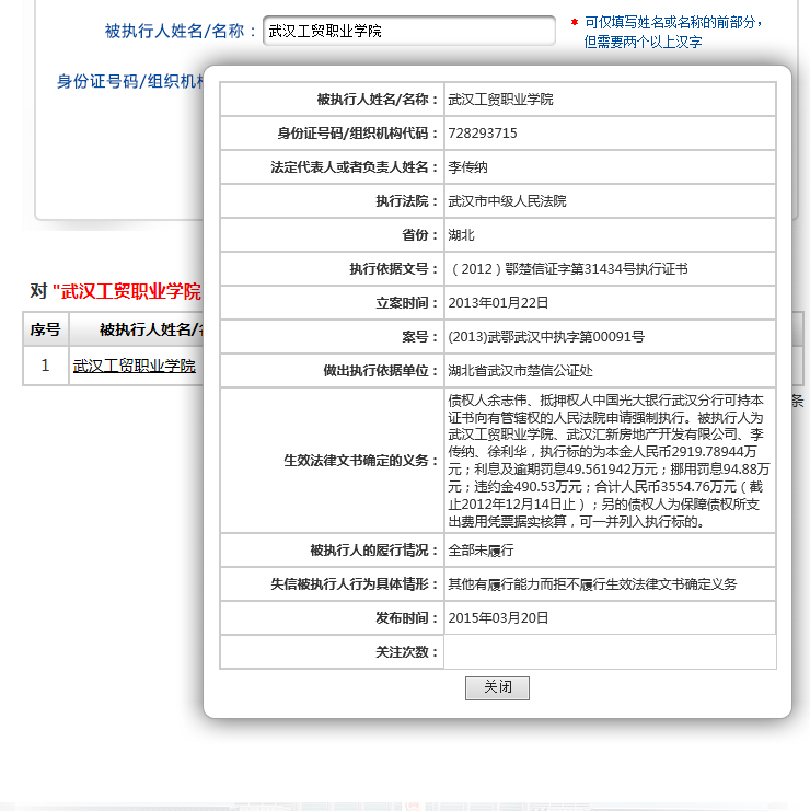 湖北首例高校"老赖"曝光 武汉工贸职院负债3800万
