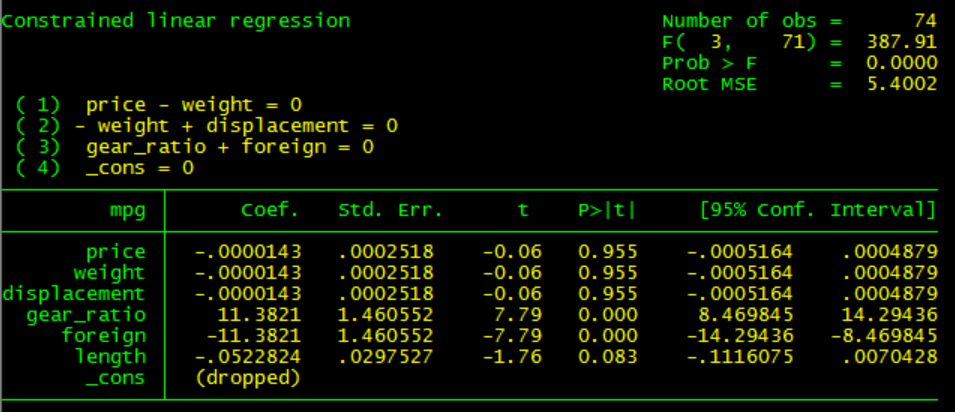 cnsreg mpg price weight displ gear_ratio foreign length, c(1-3,99)