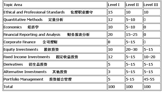 CFA考试科目:职业伦理道德、定量分析、经济学、财务报表分析、公司理财、投资组合管理、权益投资、固定收益投资、衍生品投资和其他投资等。共十门课程。每一级考试的重点不同,只是难度要求随着CFA级数的增加递增,CFA考试每个级别的侧重方向也有所不同。