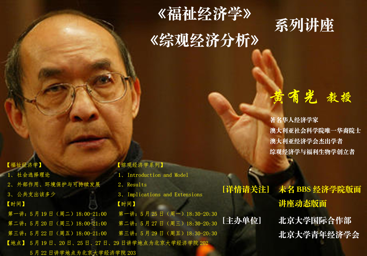 名师简介:黄有光先生为世界级的著名华人经济学家,1942年生于马来西亚,1971年获悉尼大学经济学博士学位,长期任澳大利亚Monash大学经济学教授(1974-2012),2013年起为该校荣休教授,现任新加坡南洋理工大学经济系Winsemius讲座教授。1980年当选为澳大利亚社会科学院院士。2007年获得澳大利亚经济学会最高荣誉—杰出学者。在国际顶级的经济学、哲学、生物学、心理学、社会学、数学、宇宙学等领域学术期刊(包括AER,Economica, EJ, JET, JPE, RES, SCW)发表两百余篇审稿论文,对经济学理论特别是福祉经济学作出了突出性贡献。兴趣与贡献包括:中国经济问题,福祉经济学与公共政策,提创福祉生物学、以及综合微观、宏观与全局均衡的综观分析,与杨小凯合作发展以现代数理方法分析古典的分工、专业化与经济组织的新兴古典经济学。