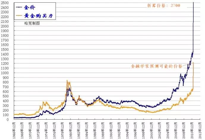 因为,他们在金价预测式中的A=1220.41,即金价泡沫可能达到的最大值,按CPI折算回来:则最大值为2700$。(见下图)当然他们不是说非要达到此值泡沫才破裂。