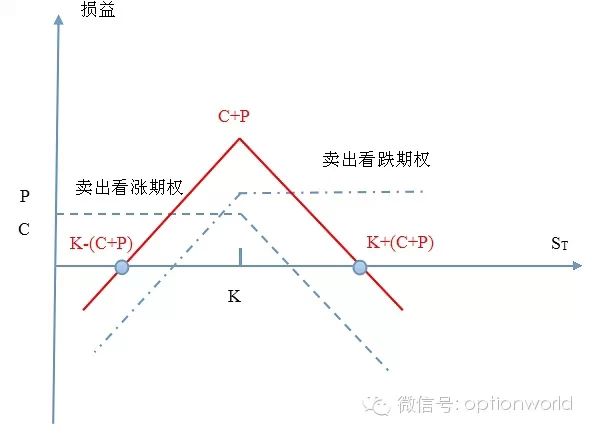假定某个股的市场价格为ST,期权执行价格为K,欧式看涨期权的权利金为C,欧式看跌期权的权利金为P。图三为该跨式组合的损益示意图。