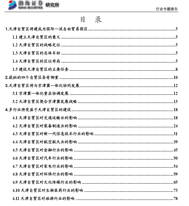 预计随着天津自贸区各项具体政策出台和贯彻实施,将对自贸区内的交通运输业、装备制造业、新一代信息技术行业、航空航天业、金融等行业产生重要拉动作用,此外,汽车行业、环保行业、文化传媒、家电行业、生物医药、旅游行业等也将有望获益。