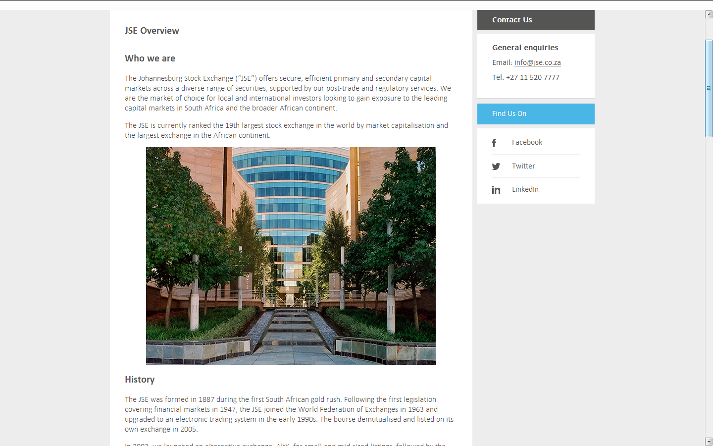 约翰内斯堡证券交易所(Johannesburg Stock Exchange,简称JSE)成立于1887年11月8日,是随着1886年维特瓦特斯兰德金矿带的发现应运而生的。成立之初主要是为金矿开发筹资,此后融资方向开始多元化,目前矿业股仍占相当地位,但工业和金融股已成为交易所的主角。